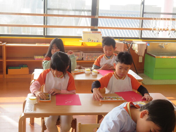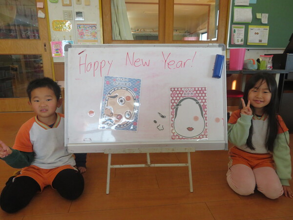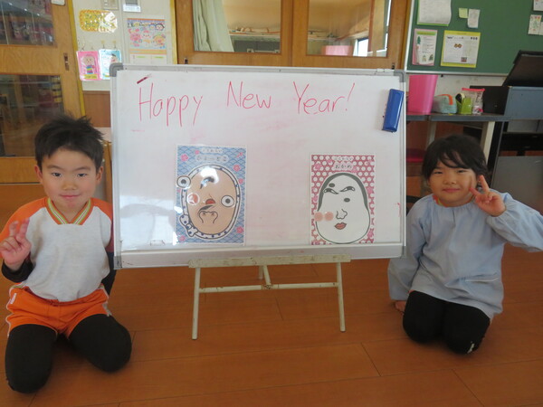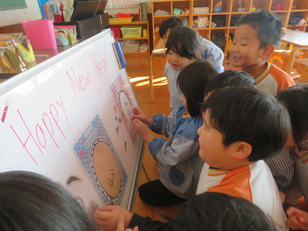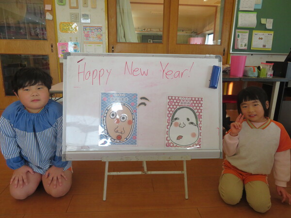 お正月の遊び「福笑い」をしました!目を閉じて、おたふくとひょっとこの顔を完成させました!いろんな顔ができとても盛り上がりましたよ♪