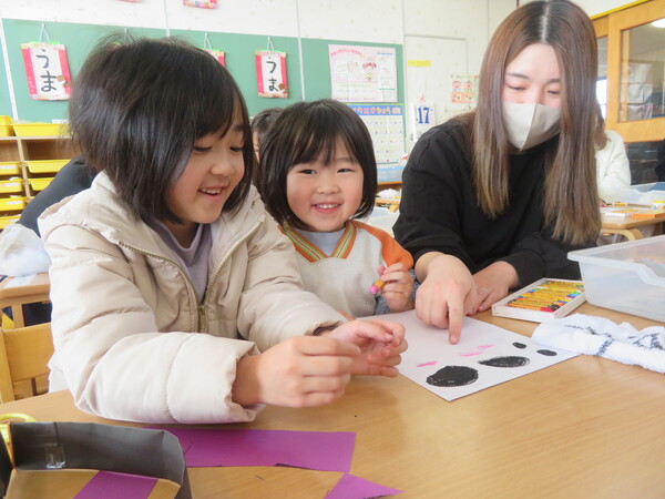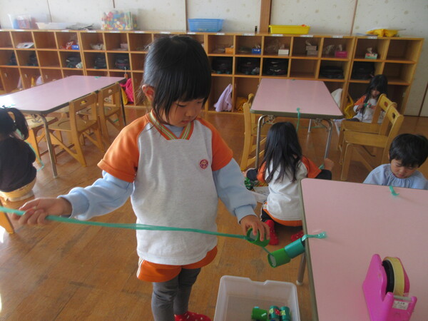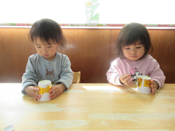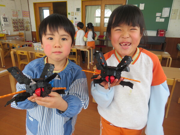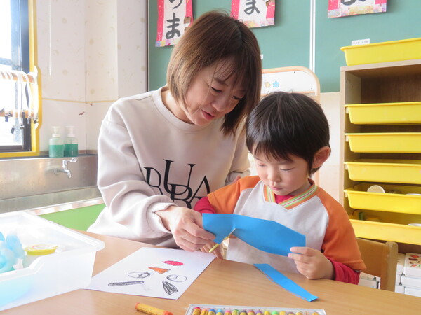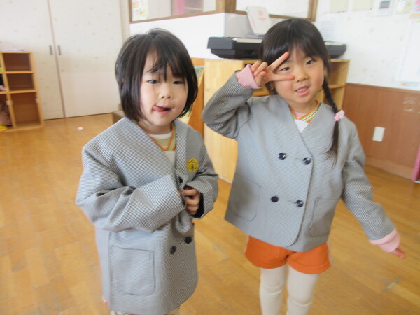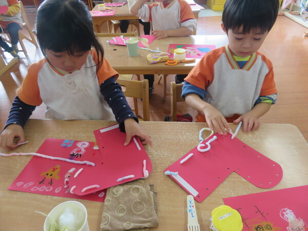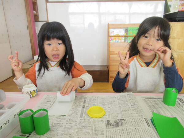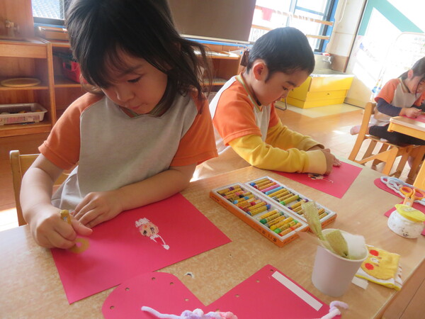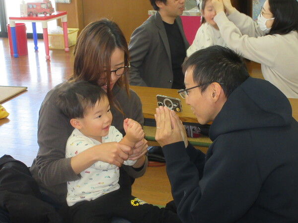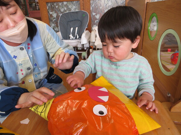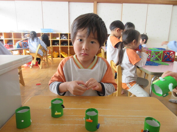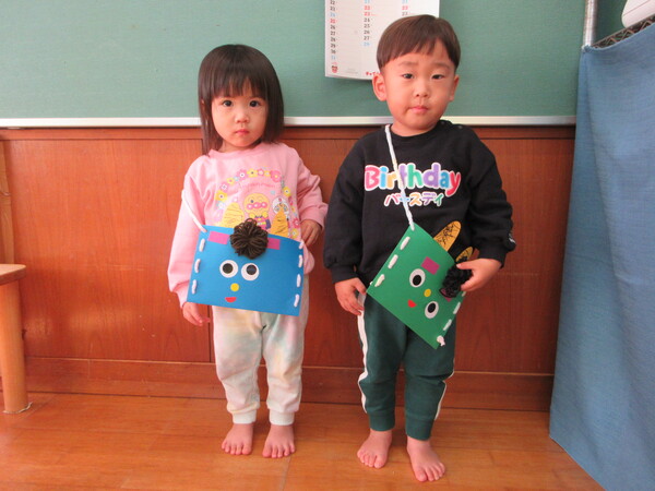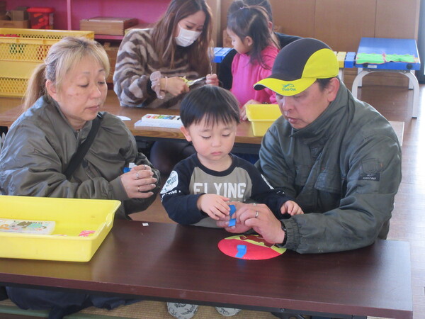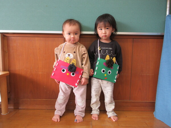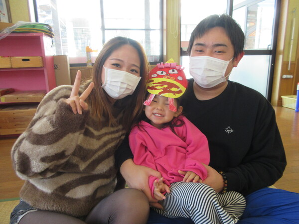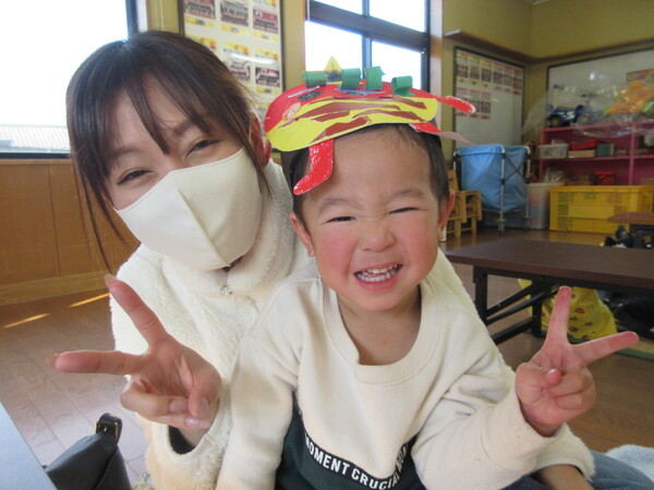 今年度最後の保育参観がありました!歌や、もも組で頑張った事、出来るようになった事を一人ひとり大きな声で発表しました!その後は、お家の方と鬼の製作を楽しみました。