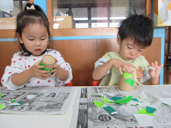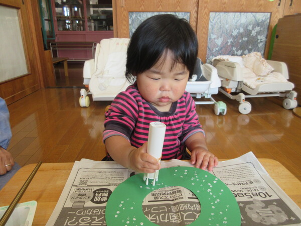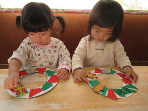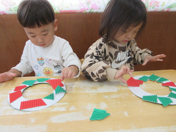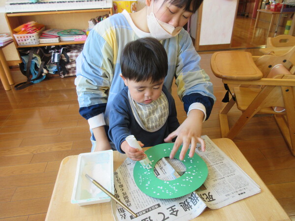 綿棒に絵の具をつけてスタンプをしました。折り紙をちぎったり、シールを張ったりしてリースをつくりました。