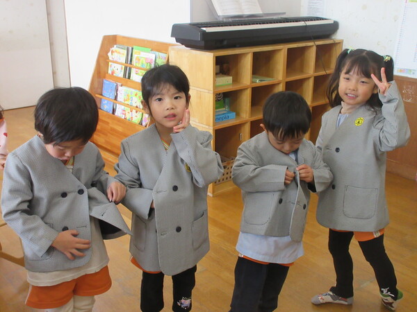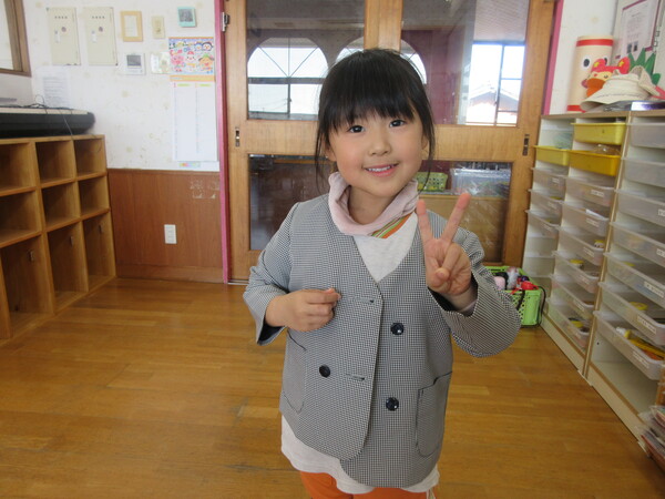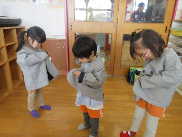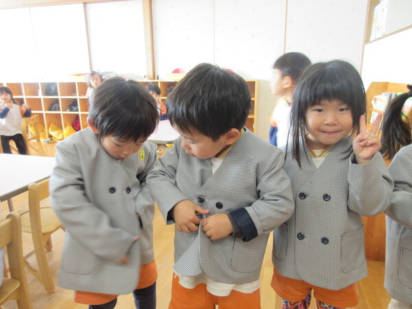 遊び感覚で始めたボタンかけの練習‼ 初めは大きなボタンから始め今では、4月から着る制服のジャケットやブラウスのボタンかけにも挑戦し頑張っています。