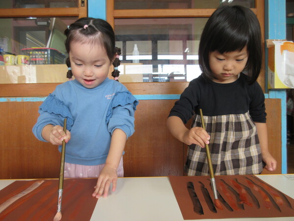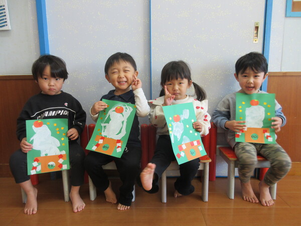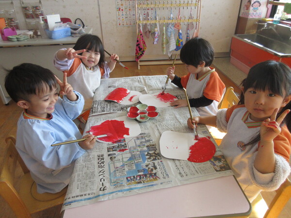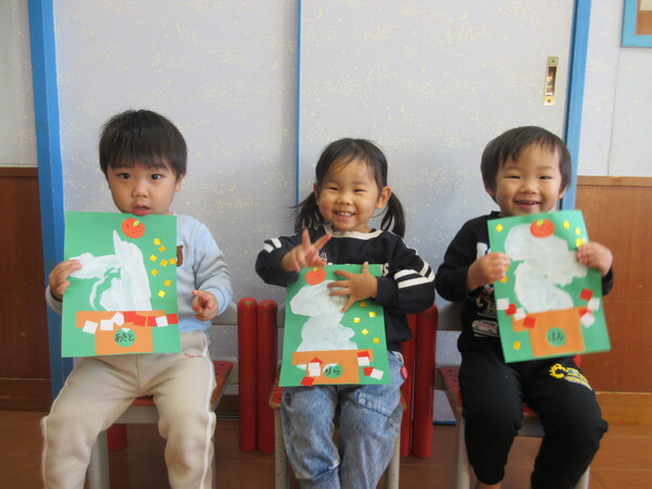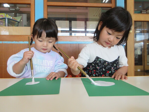 絵の具でお餅を描くよ!と伝えると、筆で大胆に丸を描いていました。お正月に鏡もちを飾ることを覚えたようで、うれしいです。