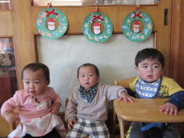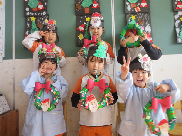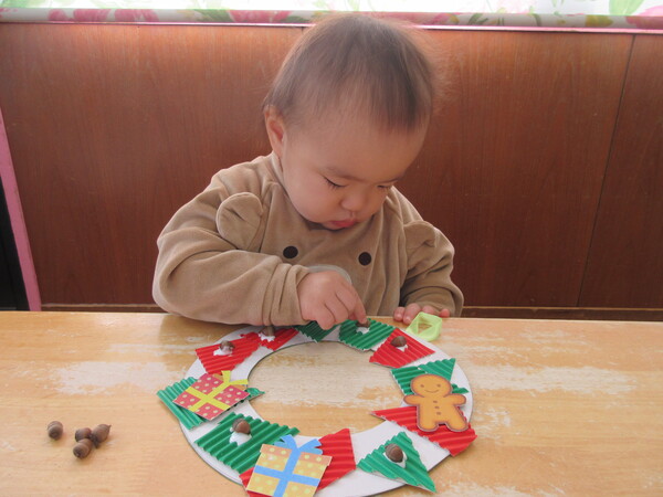クリスマスを楽しみに、トイレットペーパーの芯でリース作りをしました。自分たちで、一つ一つリースもつなげ、飾りつけもしました。最後には手形のサンタも飾り、可愛いリースが仕上がりました‼