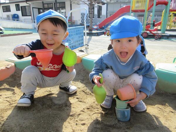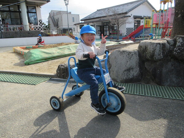 みんな三輪車に乗れるようになり、楽しそうに園庭を走っています。総合遊具や砂場遊びも楽しんでいますよ!