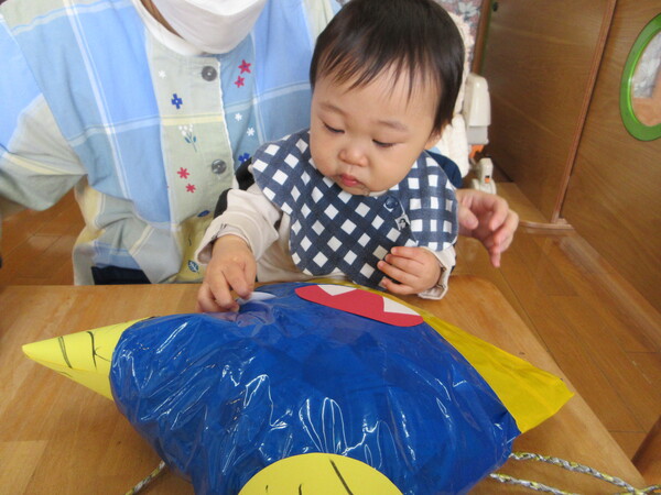 保護者の方々とにこにこで手遊びを楽しんだ後、鬼のお面作りをしました。ハサミやクレヨンを使い、かわいい鬼のお面が出来上がりましたよ!