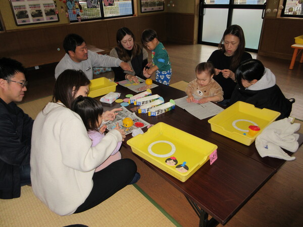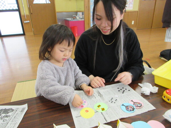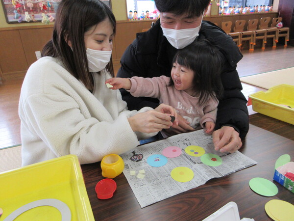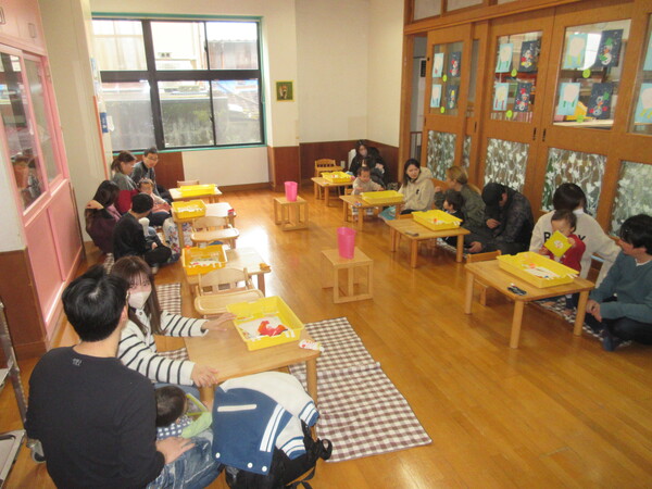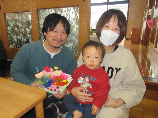 保育参観では、ひなまつり製作を行いました。おうちの方と一緒に楽しみながら素敵な作品ができました。