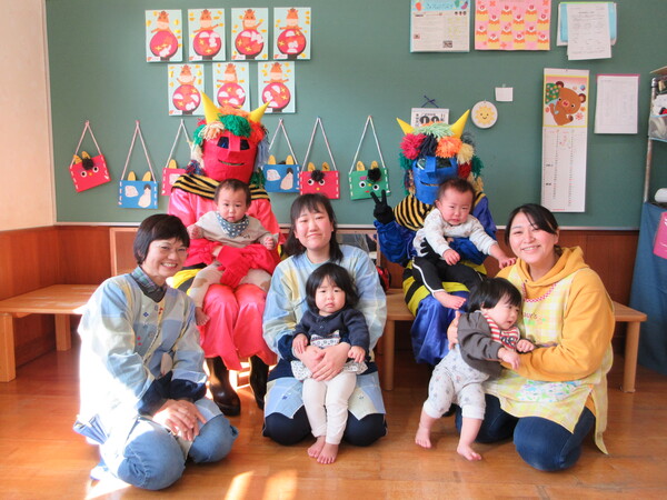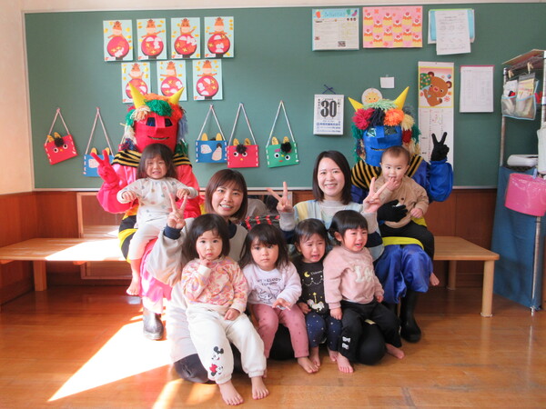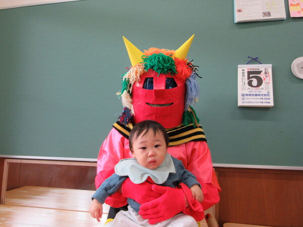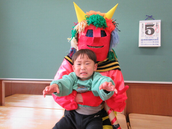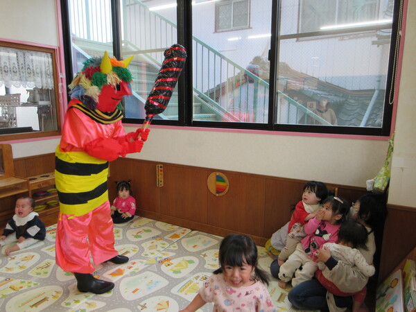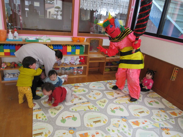 鬼の登場に涙を見せる子もいましたが、保育者と一緒に豆まきを楽しみました。季節の行事を味わうことができた子ども達です。