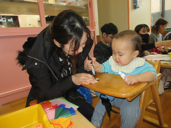 保護者の方々とにこにこで手遊びを楽しんだ後、鬼のお面作りをしました。ハサミやクレヨンを使い、かわいい鬼のお面が出来上がりましたよ!